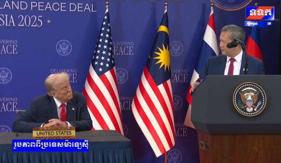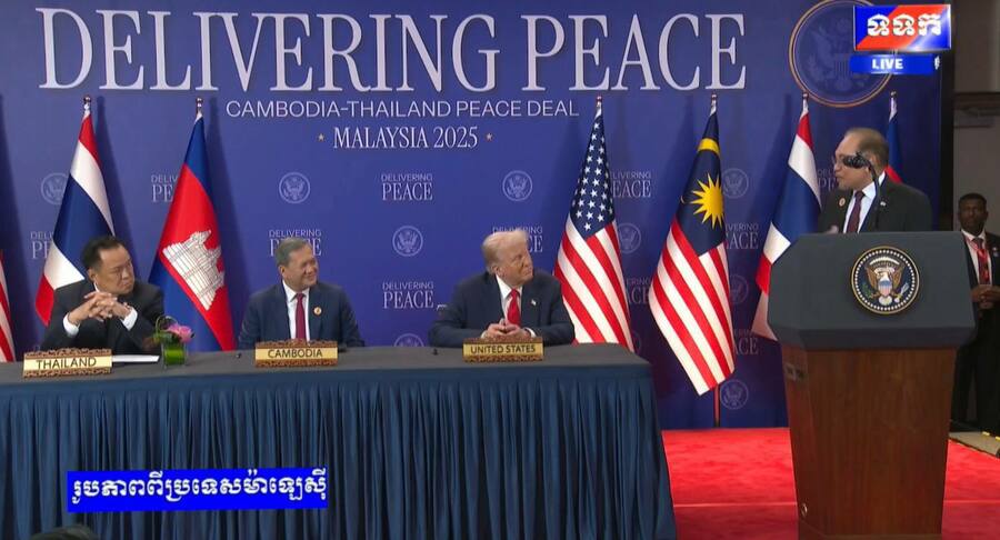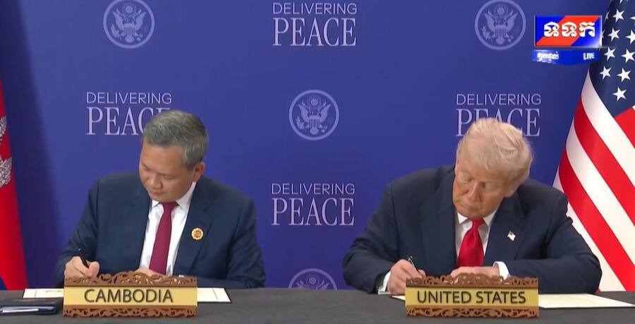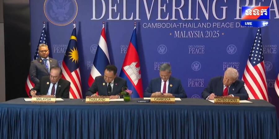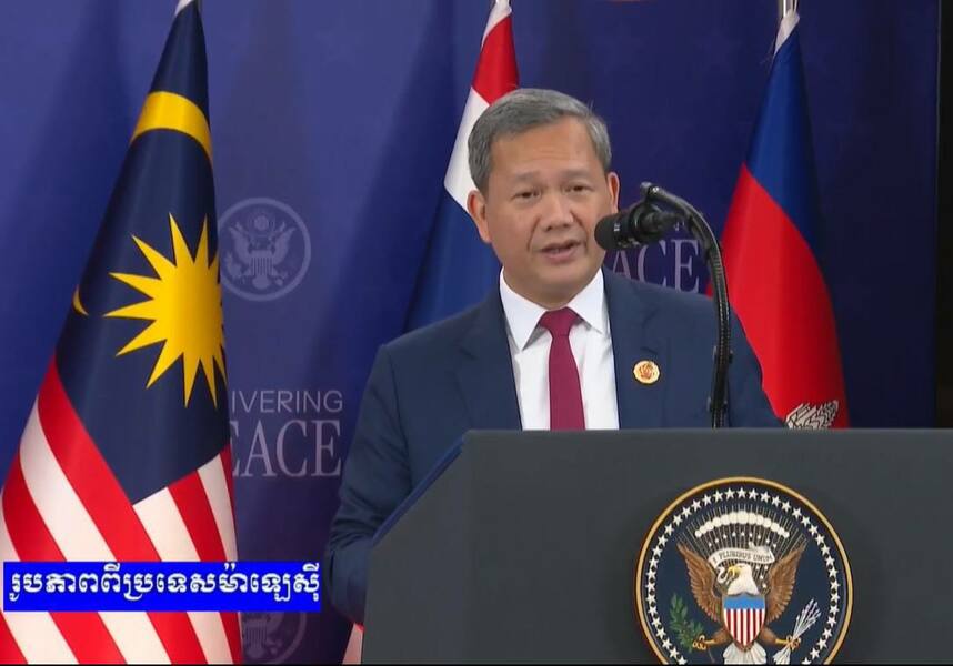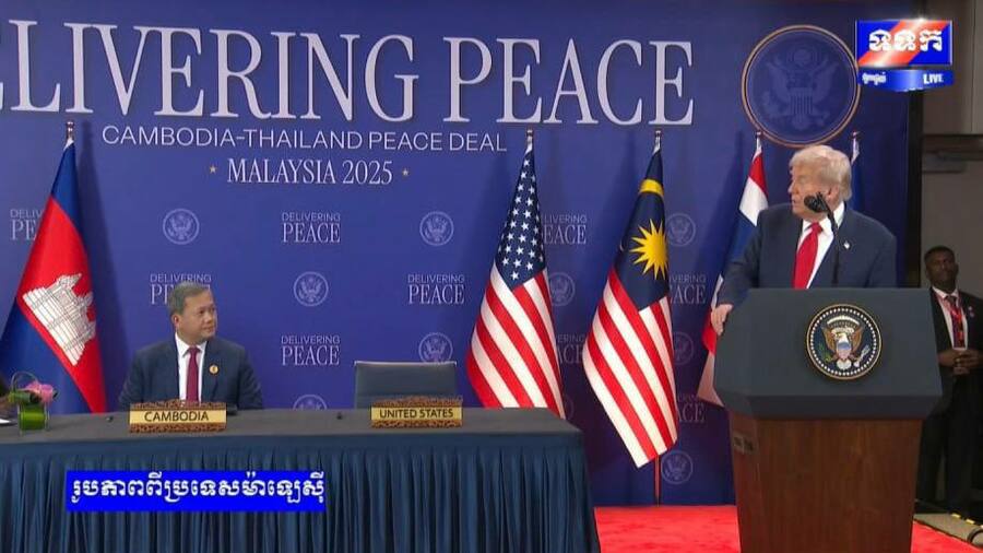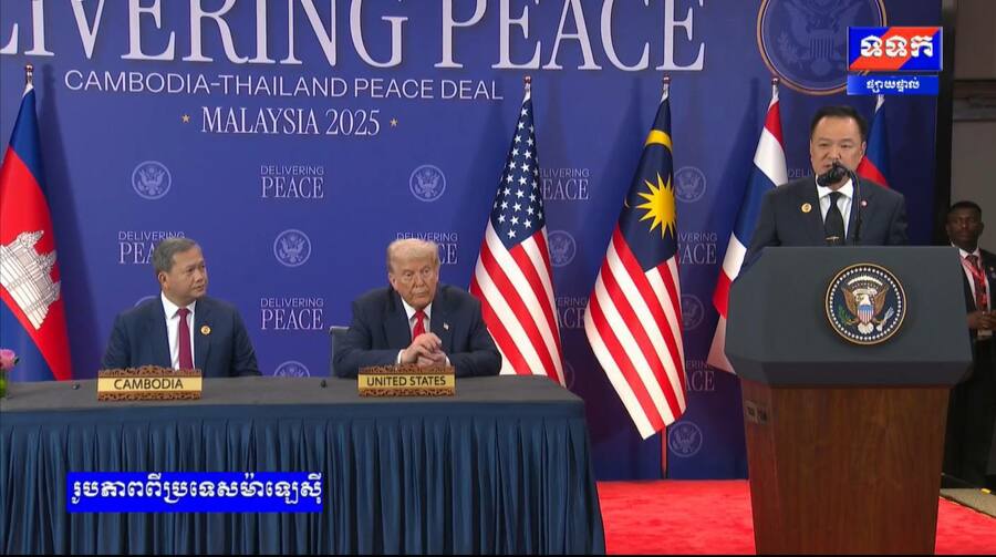 សម្តេចមហាបវរធិបតី ហ៊ុន ម៉ាណែត នាយករដ្ឋមន្ត្រី នៃព្រះរាជាណាចក្រកម្ពុជា និងឯកឧត្តម អនុទីន ឆានវីរគុល នាយករដ្ឋមន្ត្រី នៃព្រះរាជាណាចក្រថៃឡង់ដ៏ អញ្ជើញចុះហត្ថលេខាលើ “កិច្ចព្រមព្រៀងសន្តិភាព” នាព្រឹកថ្ងៃទី២៦ ខែតុលា ឆ្នាំ២០២៥ នៅរដ្ឋធានីគូឡាឡាំពួ ប្រទេសម៉ាឡេស៊ី។
